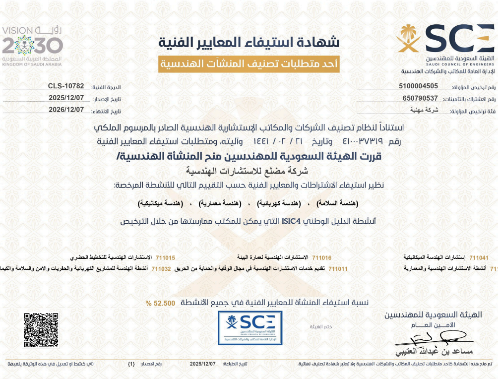 نلتزم بالاحترافية في العمل، وتطبيق الأنظمة والمعايير، مع ضمان الجودة والدقة في التنفيذ. نؤمن بالمصداقية والشفافية، ونعتمد على الابتكار وتطوير الحلول لضمان نجاحٍ مستدام.